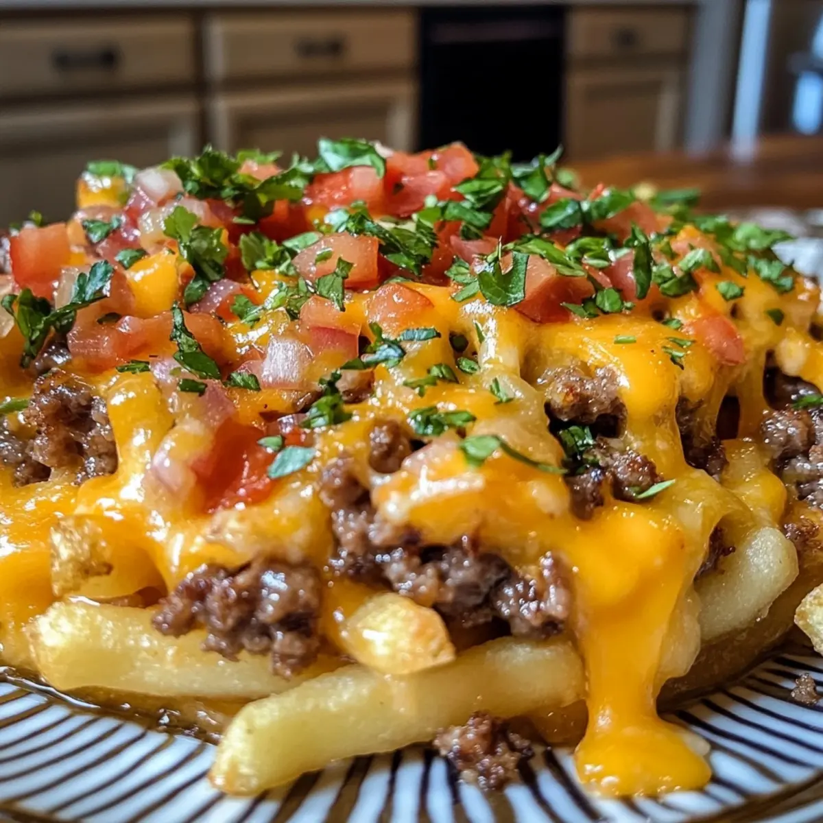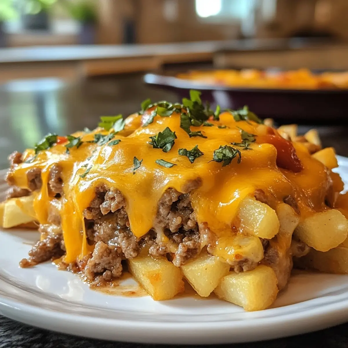 - Layer Casserole: Grease a 9×13-inch baking dish and spread 4 cups of frozen French fries evenly across the bottom. Then, spoon the beef mixture over the fries, distributing it evenly.