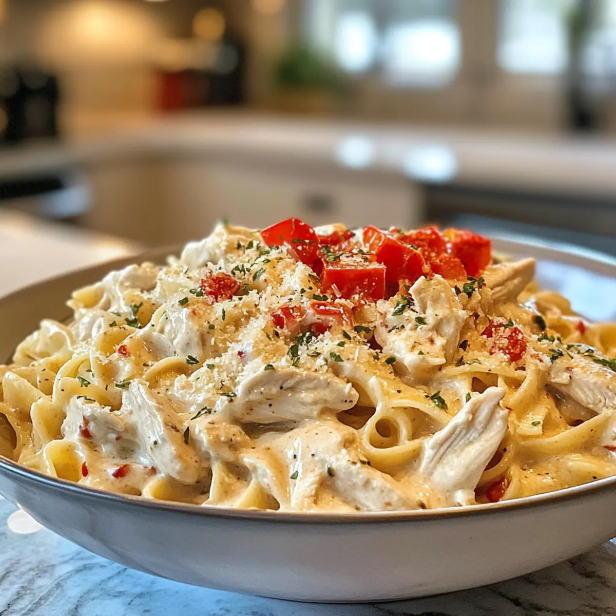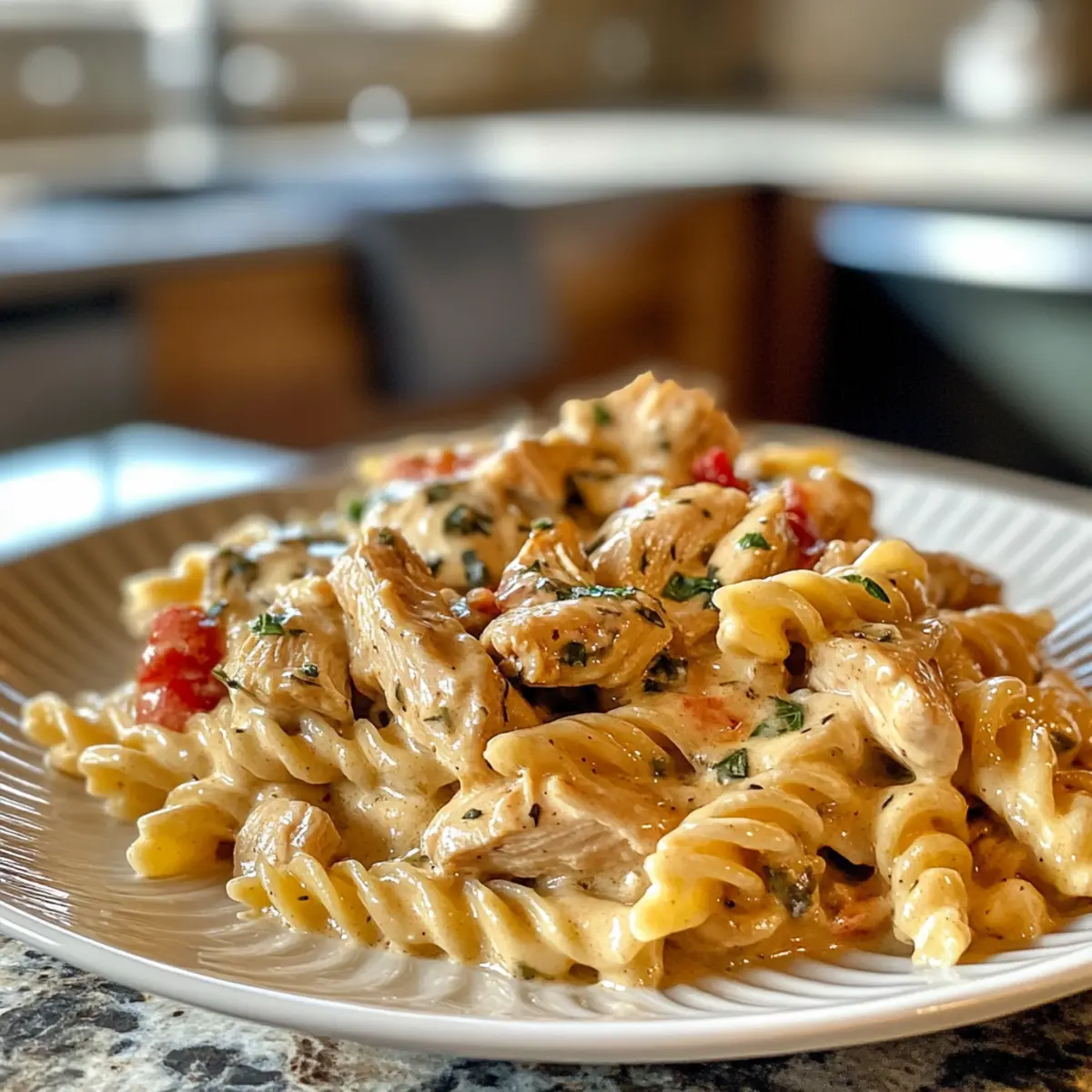 This Creamy Crock Pot Tuscan Chicken Pasta is a delightful fusion of tender chicken, sun-dried tomatoes, and fresh spinach in a creamy sauce.