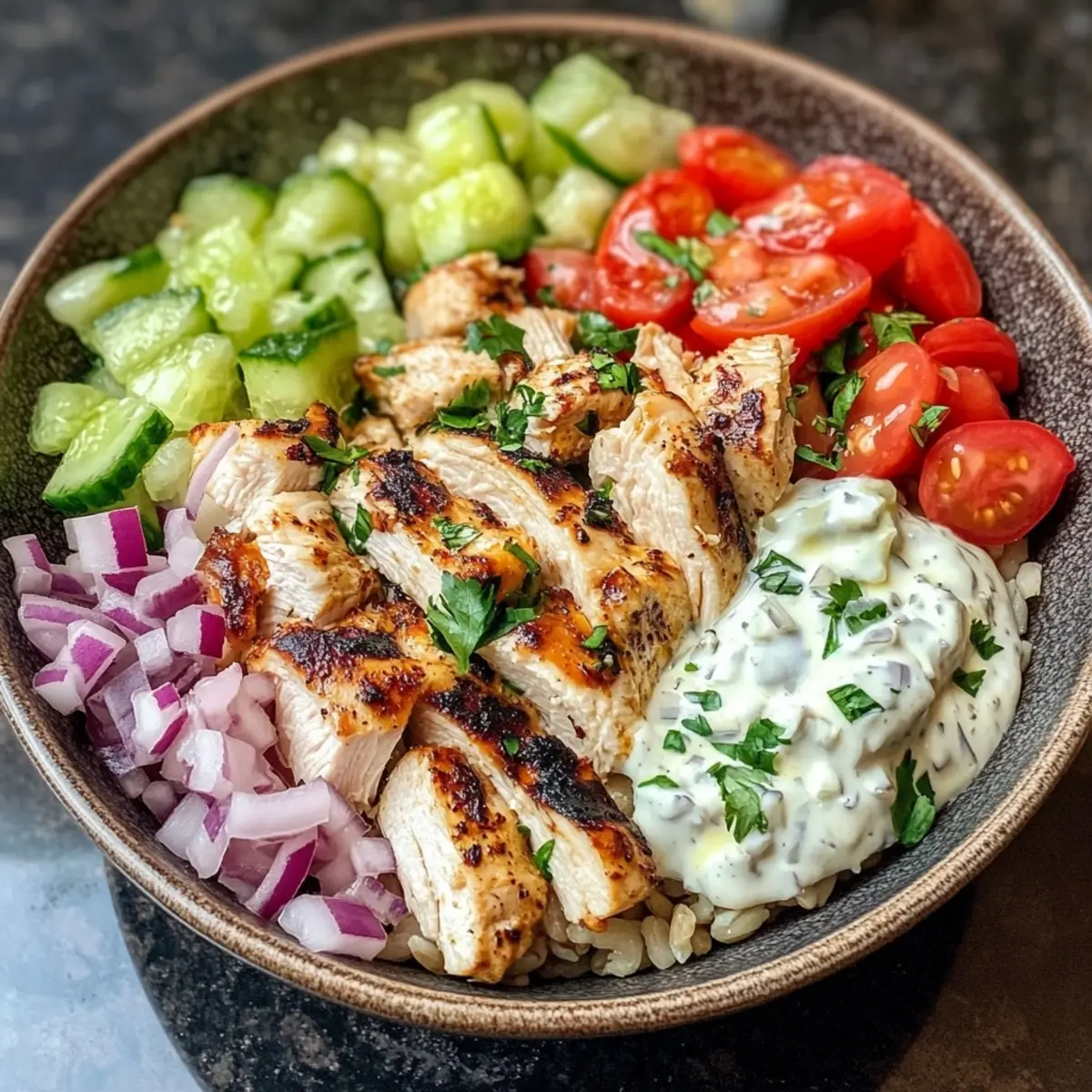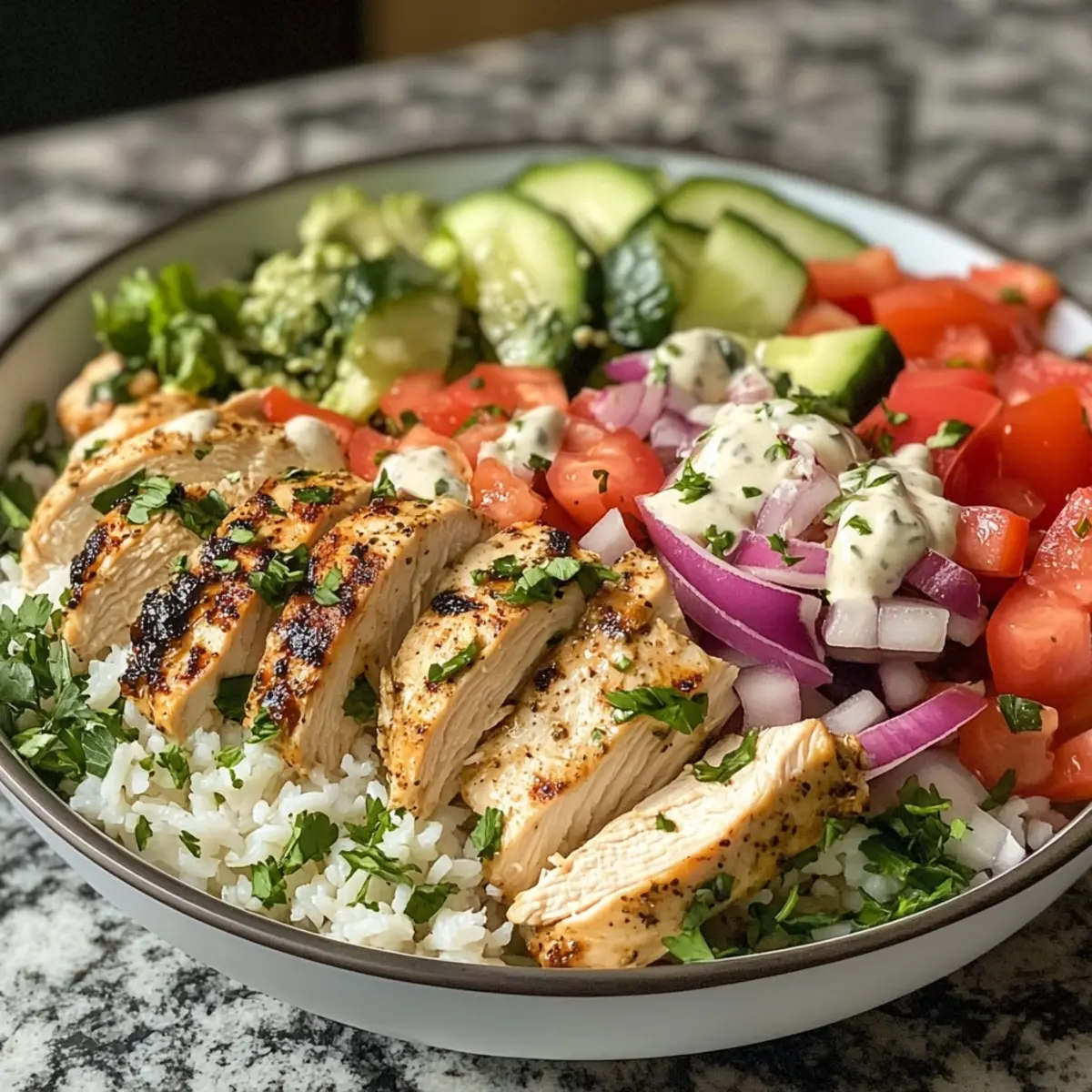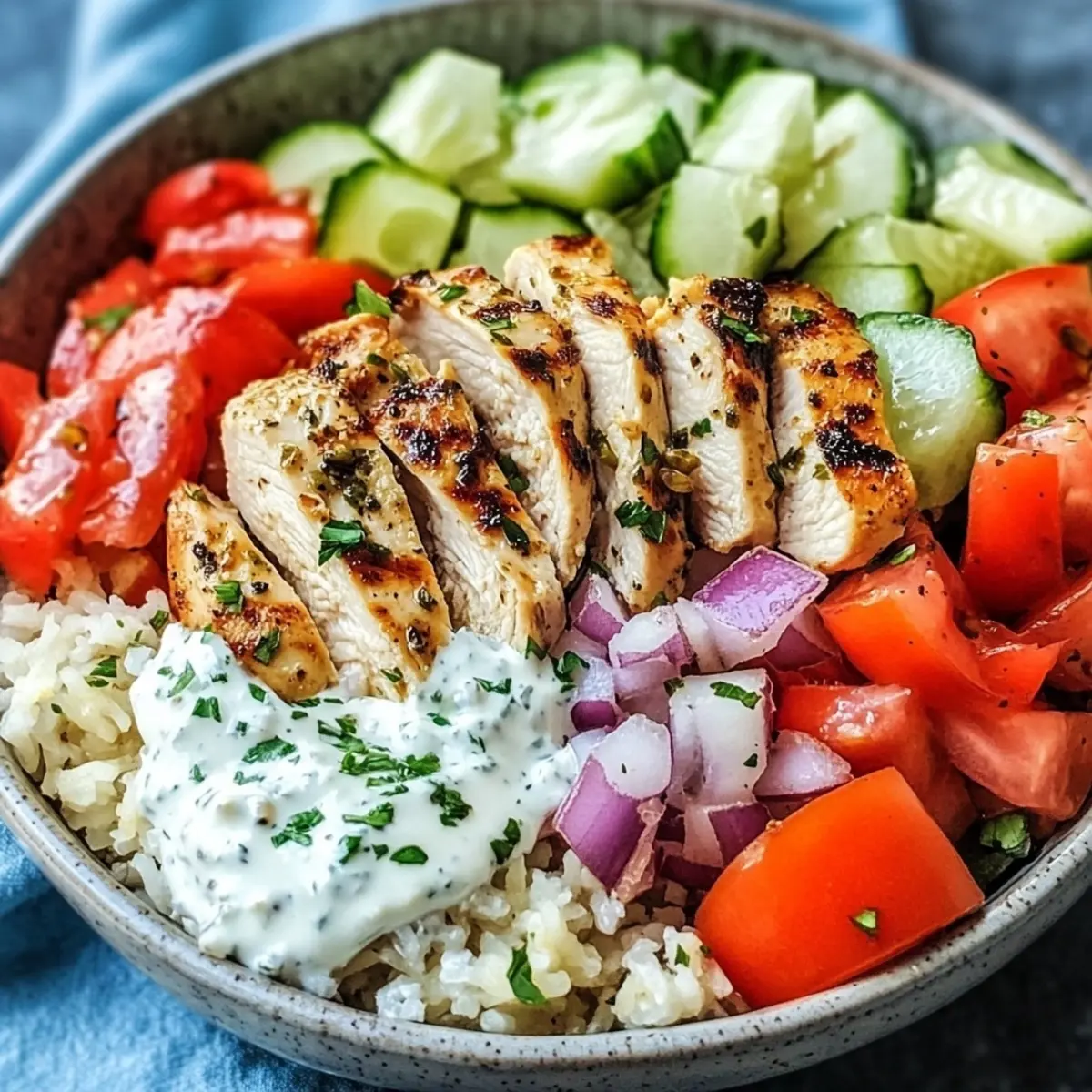 - Assemble Your Bowls: In serving bowls, layer a generous scoop of cooked rice (or cauliflower rice), followed by sliced chicken, cherry tomatoes, cucumber, red onion, kalamata olives, and feta cheese.