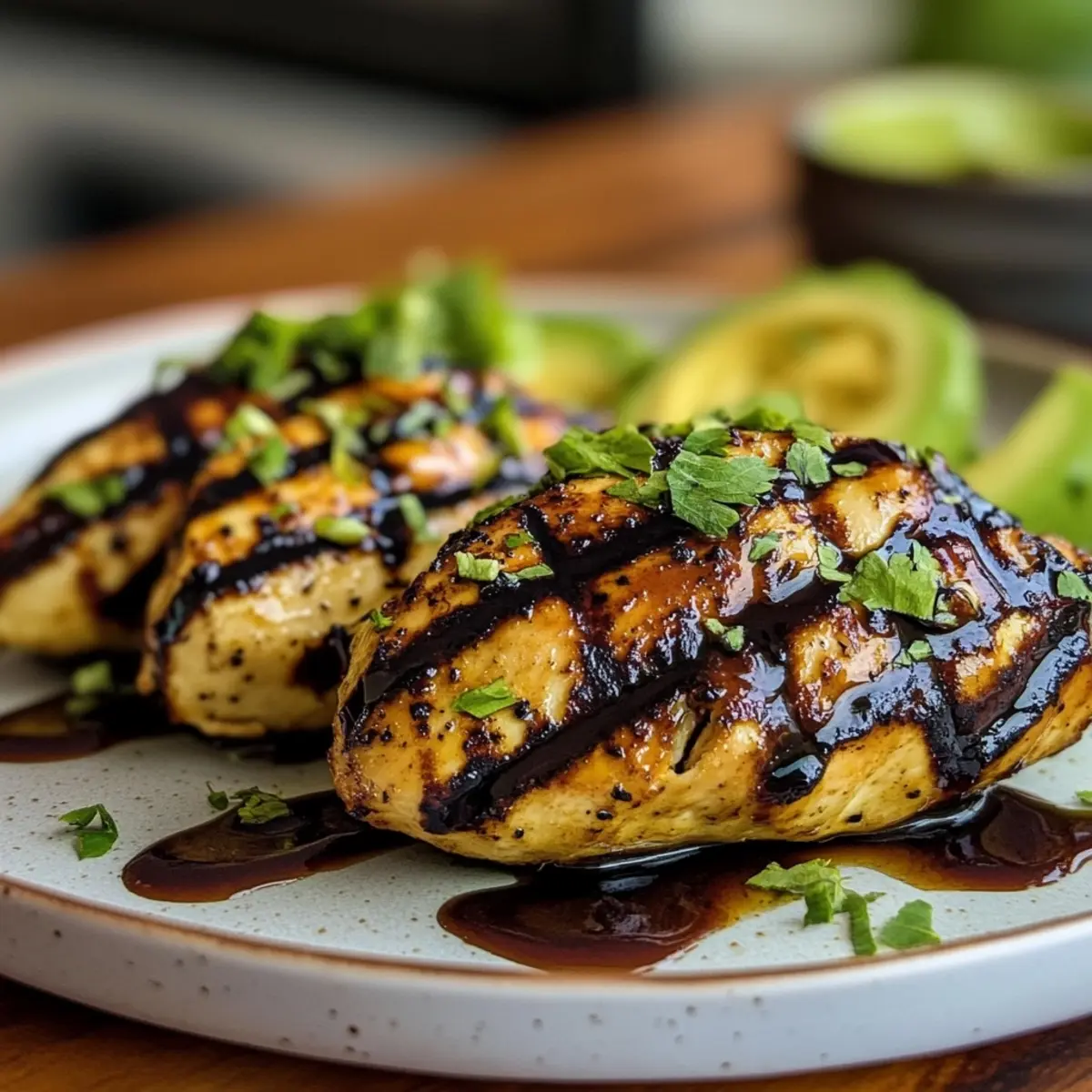 Remove the chicken from the grill and layer on the sliced avocado and fresh tomatoes. Drizzle with balsamic glaze or fresh lime juice for that zesty finish. - Garnish: