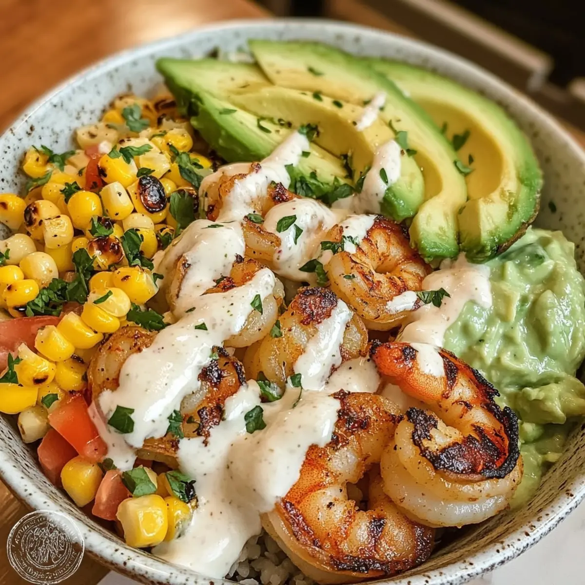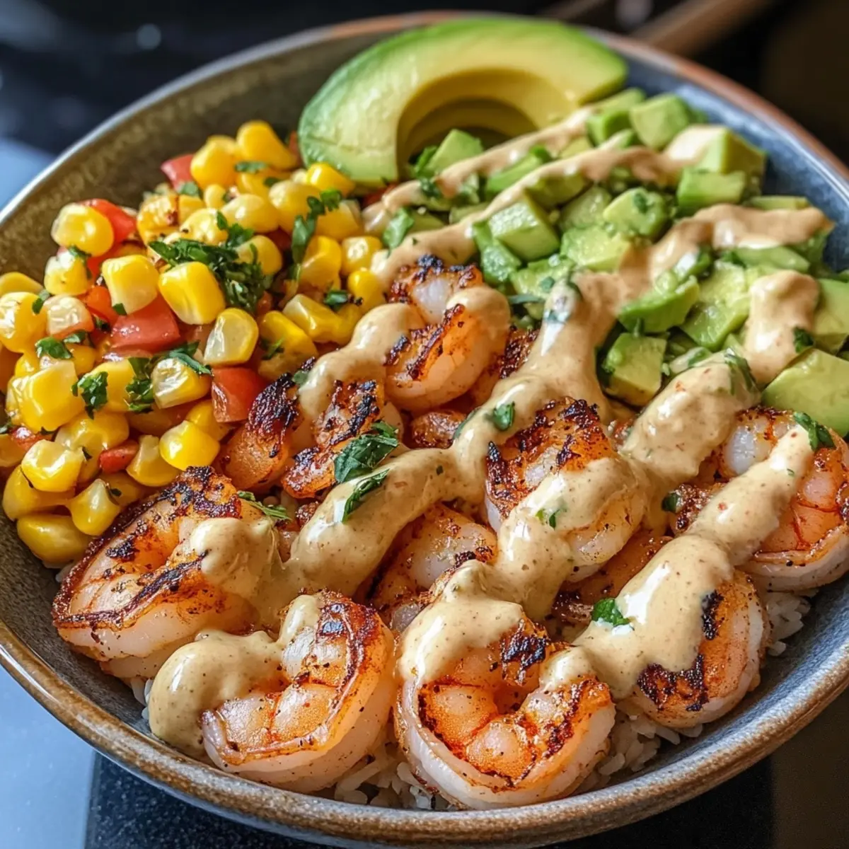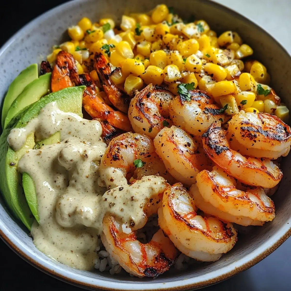 - Assemble Bowls: Divide the corn salsa among bowls, layer on the grilled shrimp, and add sliced or mashed avocado on top. Drizzle with the creamy garlic sauce and finish with a sprinkle of sesame seeds and chopped green onions for an extra touch.