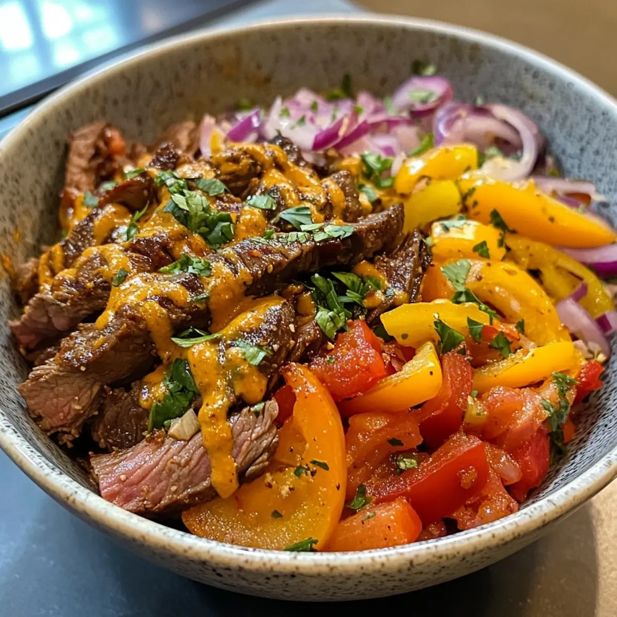 Colorful Medley: This bowl isn’t just a meal; it’s a vibrant feast for your eyes and taste buds, with tender steak, bright bell peppers, and sweet onions dancing together.