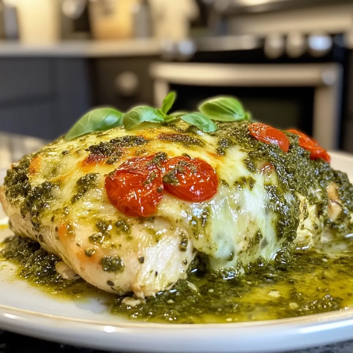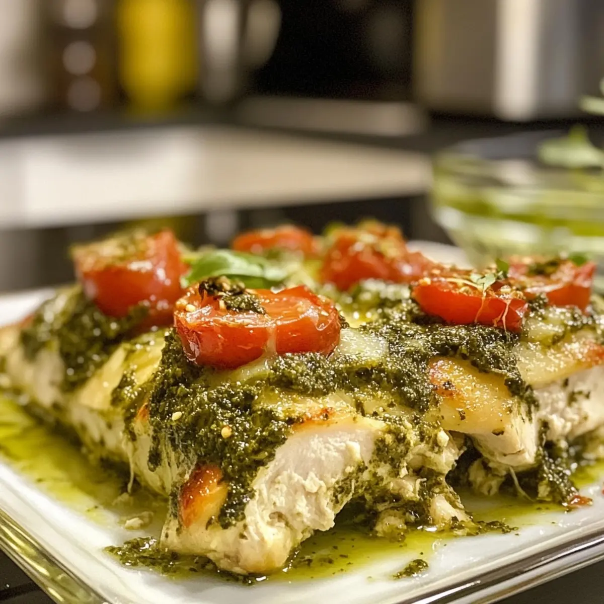 Sprinkle shredded mozzarella and grated Parmesan evenly over the pesto-coated chicken; this creates a delicious, gooey layer that melts beautifully in the oven. Optionally, arrange halved cherry tomatoes around the chicken for added sweetness and color.