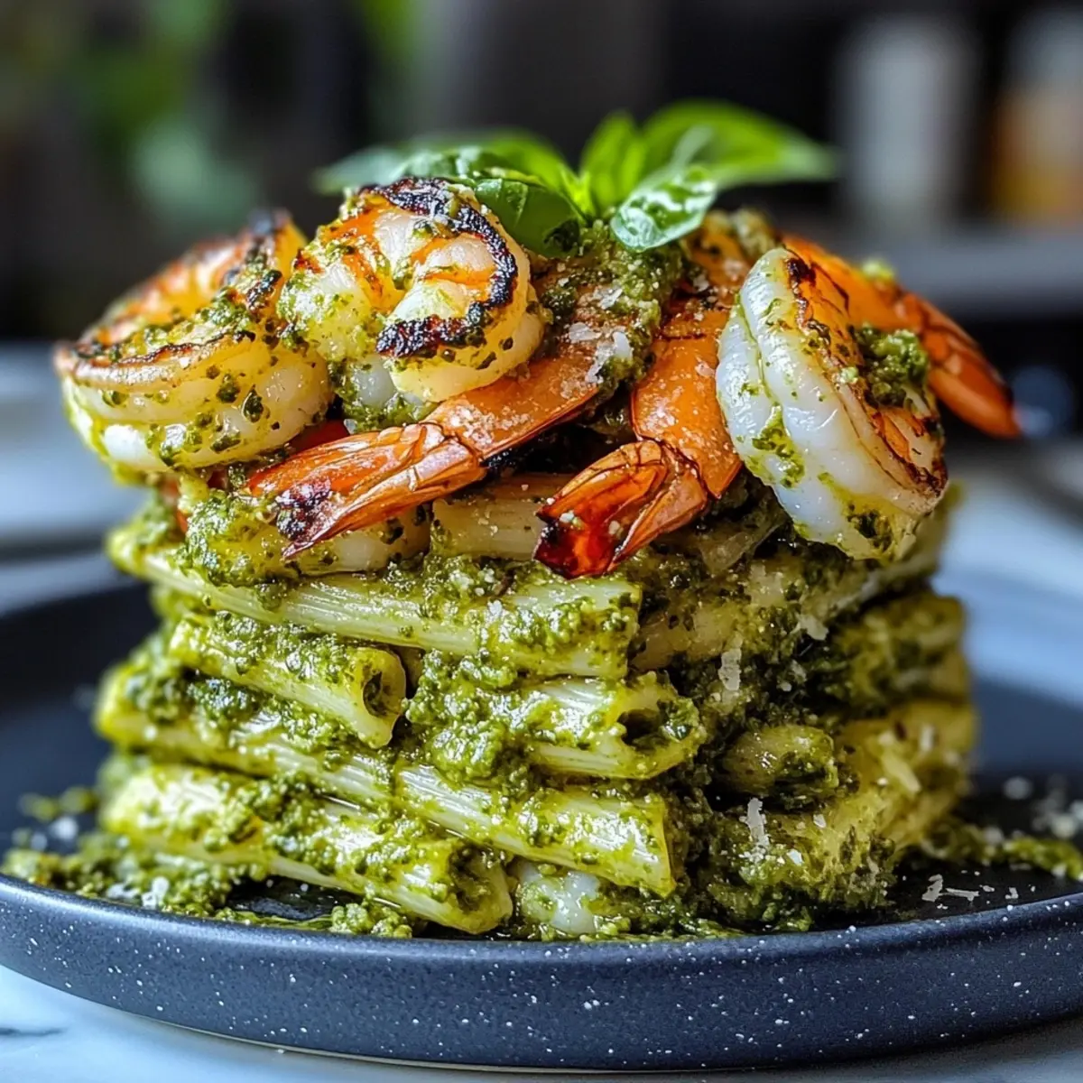 This Pesto Pasta and Grilled Shrimp Stack delights with its simplicity and elegance, making it a must-try for your next dinner!