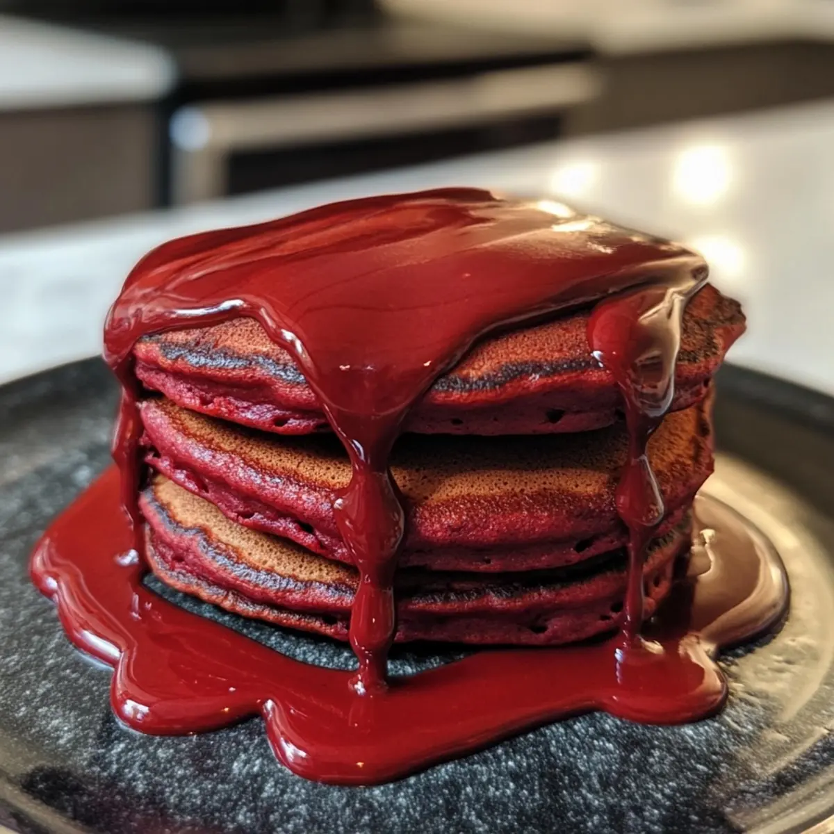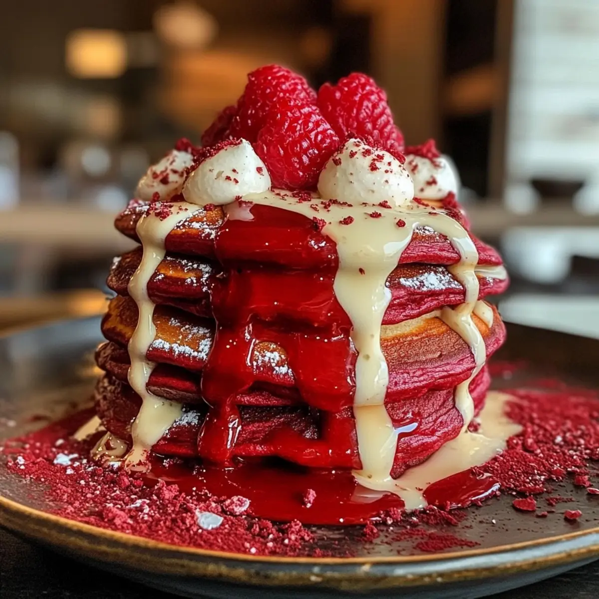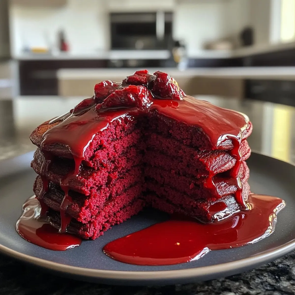 Irresistibly Indulgent Red Velvet Pancakes with Creamy Glaze