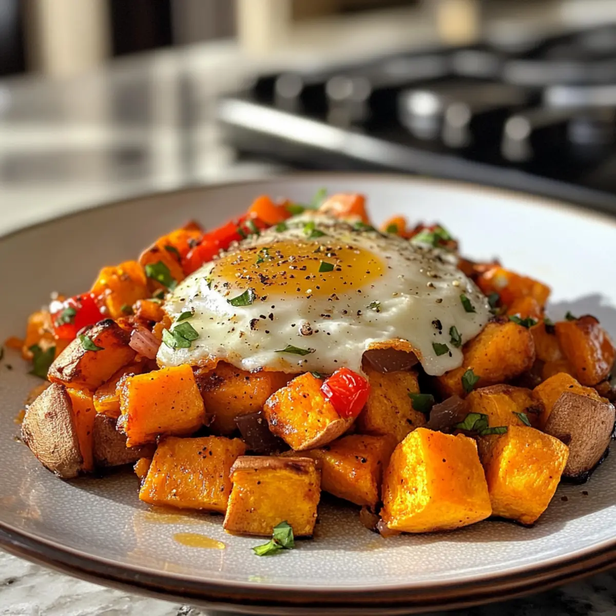 - Once everything is cooked, plate the sweet potato breakfast hash, topping it with eggs if using. Finish with a sprinkle of fresh herbs and, optionally, a few avocado slices for added creaminess.