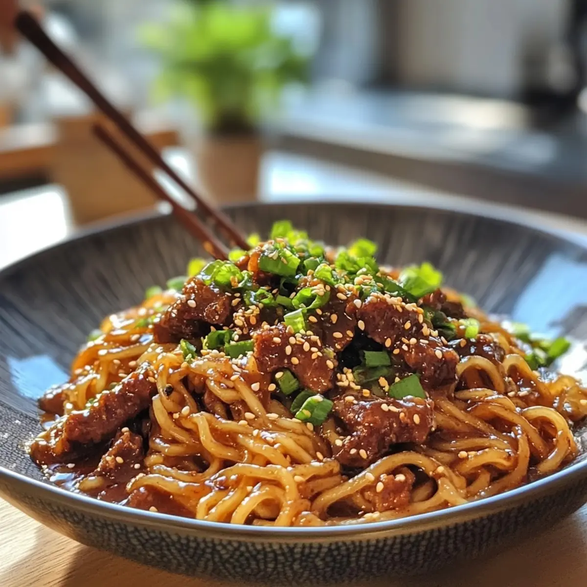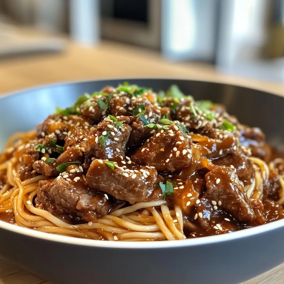 - Combine & Serve: Return the cooked beef to the skillet, pour in the prepared sauce, and mix everything well. Cook for an additional 2 minutes until the sauce thickens beautifully. Add the noodles, toss to combine, and serve garnished with green onions and sesame seeds for that extra flair!