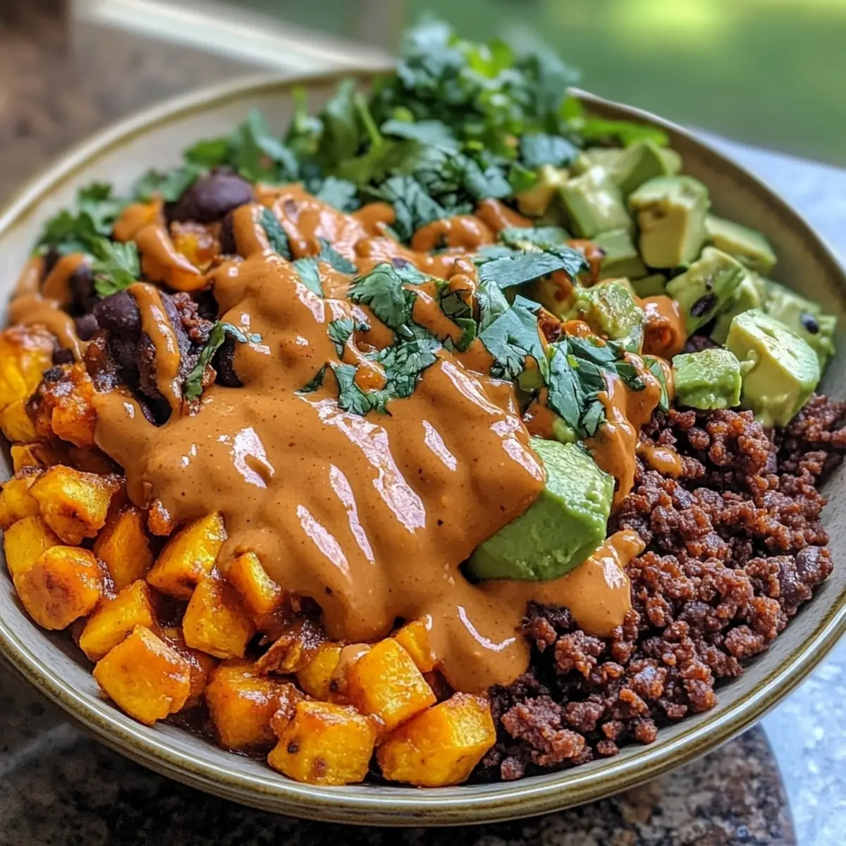 - Assemble Bowls: Once everything is ready, take serving bowls and layer in the roasted sweet potatoes first, followed by the seasoned beef, pico de gallo, guacamole, and a dollop of sour cream.