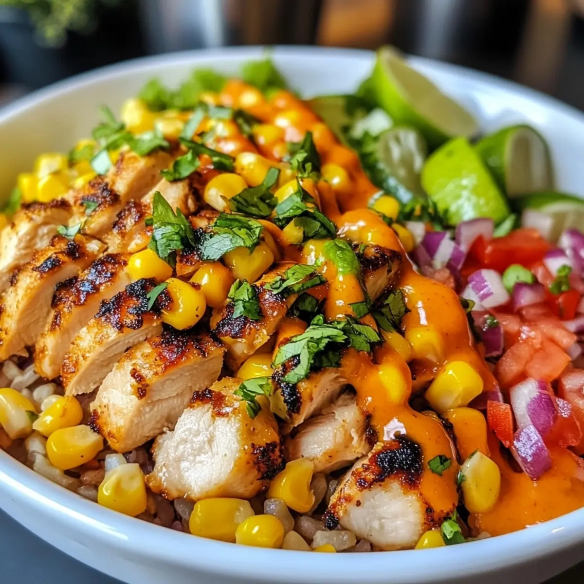 - Assemble the Bowl: In serving bowls, create a base with the fluffy rice, then layer the sliced chicken on top, followed by a generous helping of the vibrant street corn mix. Finish by garnishing with extra cotija cheese, fresh cilantro, and lime wedges for that perfect zing.